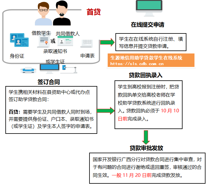 4.首贷申请需与县区资助中心“预约时间办理”签订借款合同的,请预约成功后携带申请材料,与共同借款人到本县(市、区)资助中心办理贷款申请并签订合同(双方必须亲自到场),领取贷款受理证明;无需预约的县区可直接携带申请资料与共同借款人到本县(市、区)资助中心办理贷款申请并签订合同(双方必须亲自到场),领取贷款受理证明。(续贷申请实行“线上办理”,“线上办理”具体流程另行通知。)