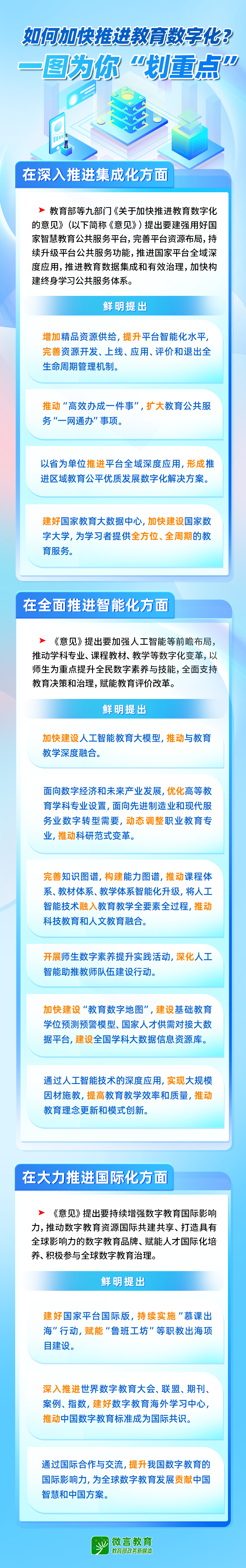 为贯彻落实《教育强国建设规划纲要(2024—2035年)》,以教育数字化为重要突破口,开辟教育发展新赛道和塑造发展新优势,全面支撑教育强国建设,近日,教育部等九部门联合发布《关于加快推进教育数字化的意见》,一起来“划重点”——