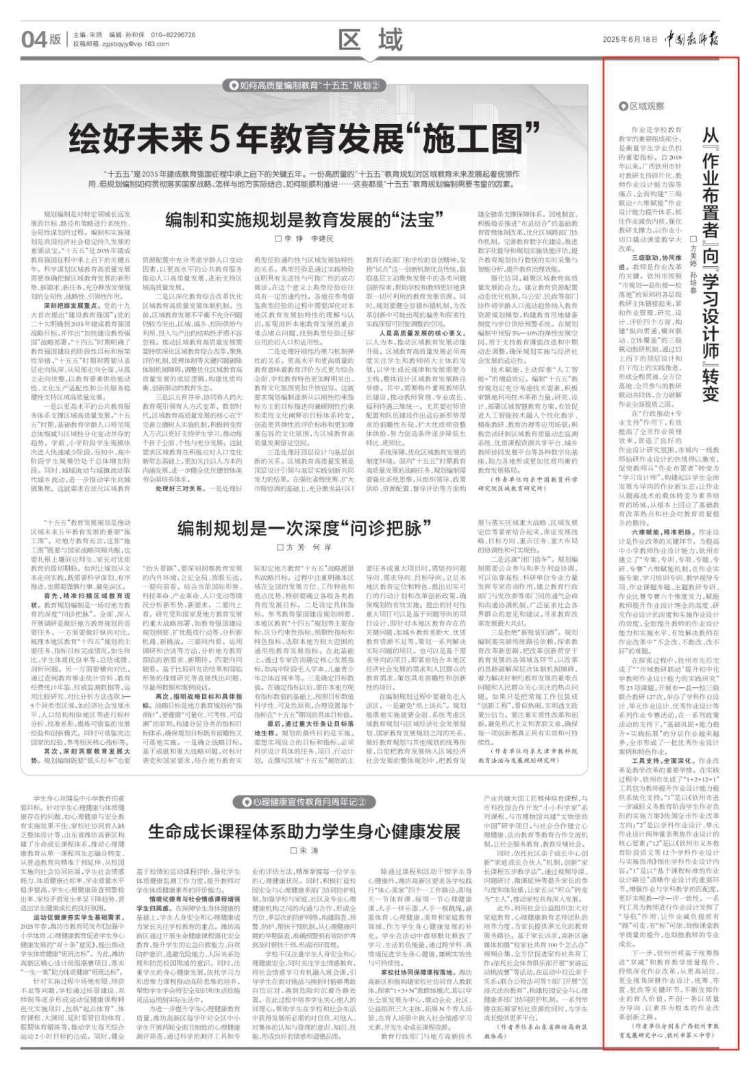 6月18日,《中国教师报》刊发文章《从“作业布置者”向“学习设计师”转变》,报道我市积极构建“三级联动·六维赋能”的作业设计能力提升体系,以作业小切口撬动课堂教学大改革的教育实践。