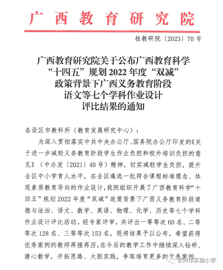 热烈祝贺钦州市实验小学覃慧愉老师负责的《“双减”背景下小学数学有效作业的设计与实施研究》专项课题成果在2022年度“双减”政策背景下广西义务教育阶段语文等七个学科作业设计评选活动中荣获一等等次。