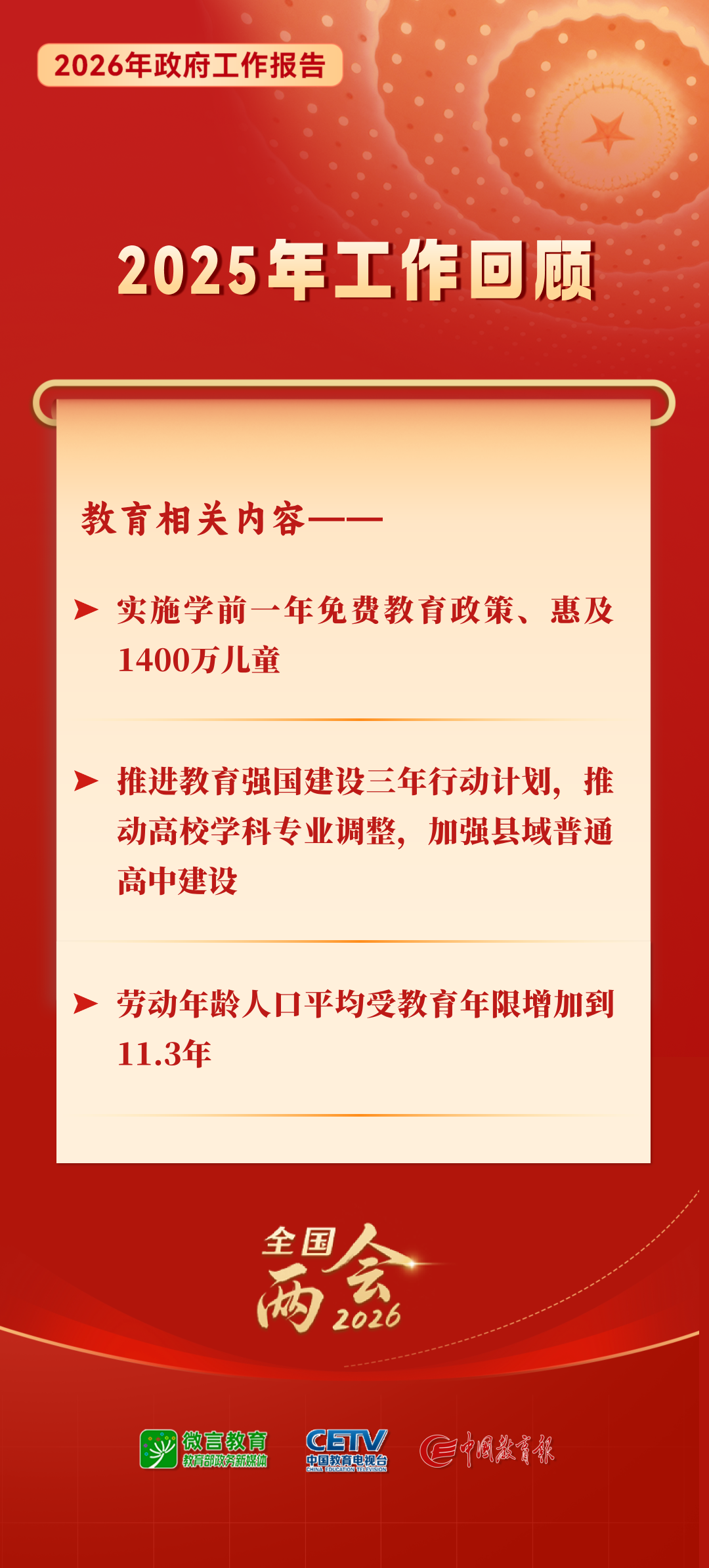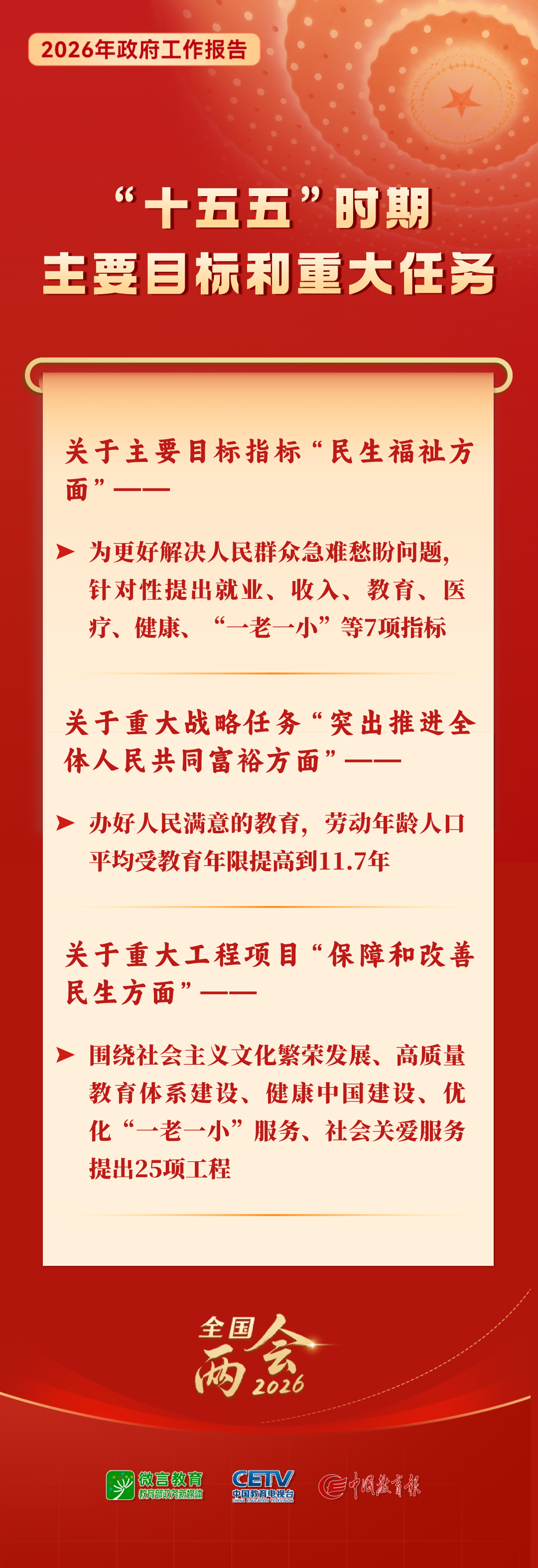 3月5日上午9时,十四届全国人大四次会议在人民大会堂举行开幕会。国务院总理李强作政府工作报告时,回顾了2025年工作,介绍了“十五五”时期主要目标和重大任务、2026年政府工作任务。其中教育相关的主要内容,一起来看长图——