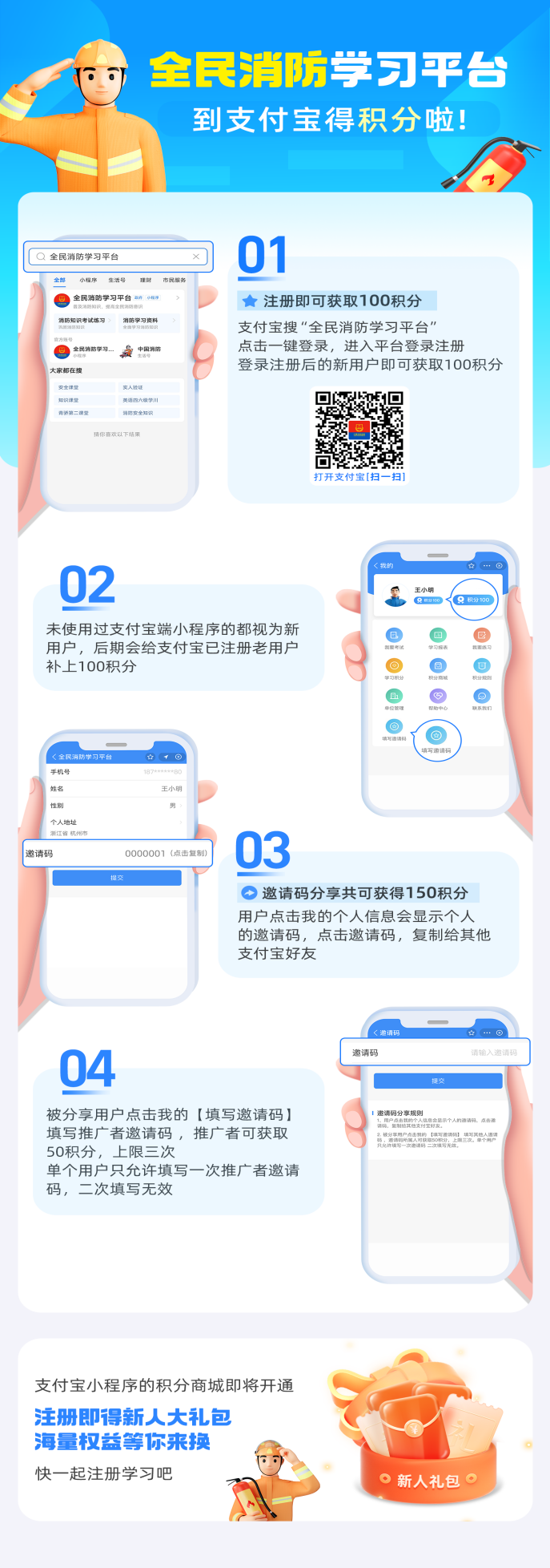 (三)开展消防安全“线上学习”活动。各县区教育局、各学校要广泛发动,引导家长陪同孩子通过中国消防《全民消防安全学习平台》(注册及学习方法见附件1)在线学习消防安全知识。其中,寒假期间,每个家庭陪同孩子完成600积分的学习任务(积分规则见附件2),上不封顶,积分前十名将会获得市消防救援支队赠送的消防安全文创小礼物。同时,2023年1月底前,各学校要积极组织学生家长关注“钦州消防”微信公众号,与学生共同完成一份寒假消防作业(见附件3)。